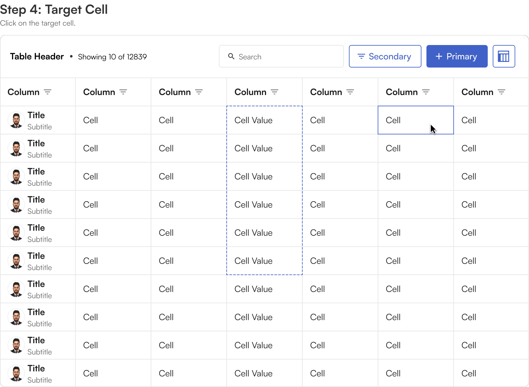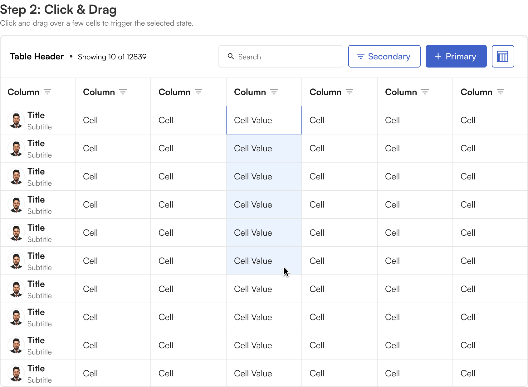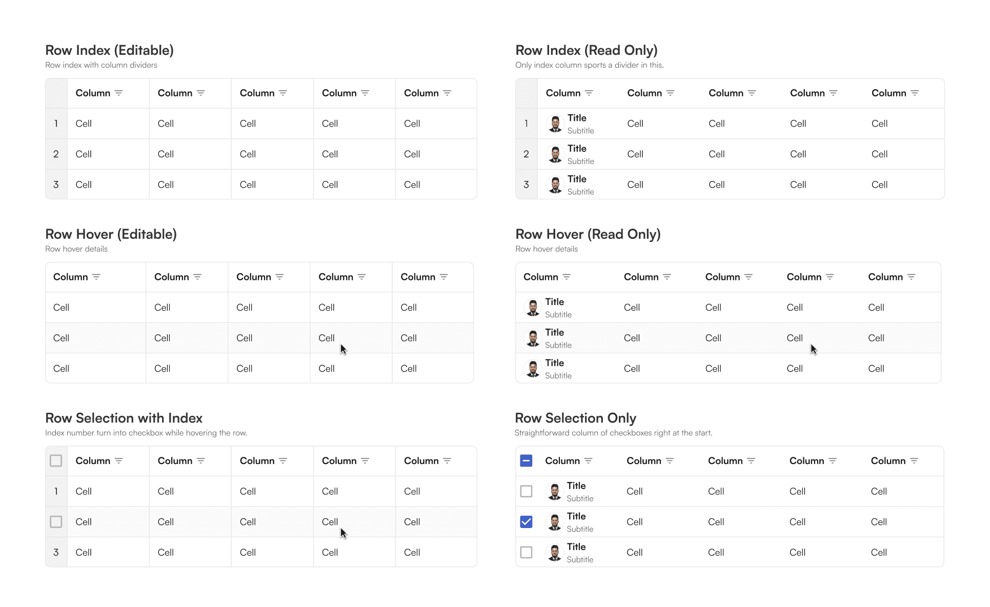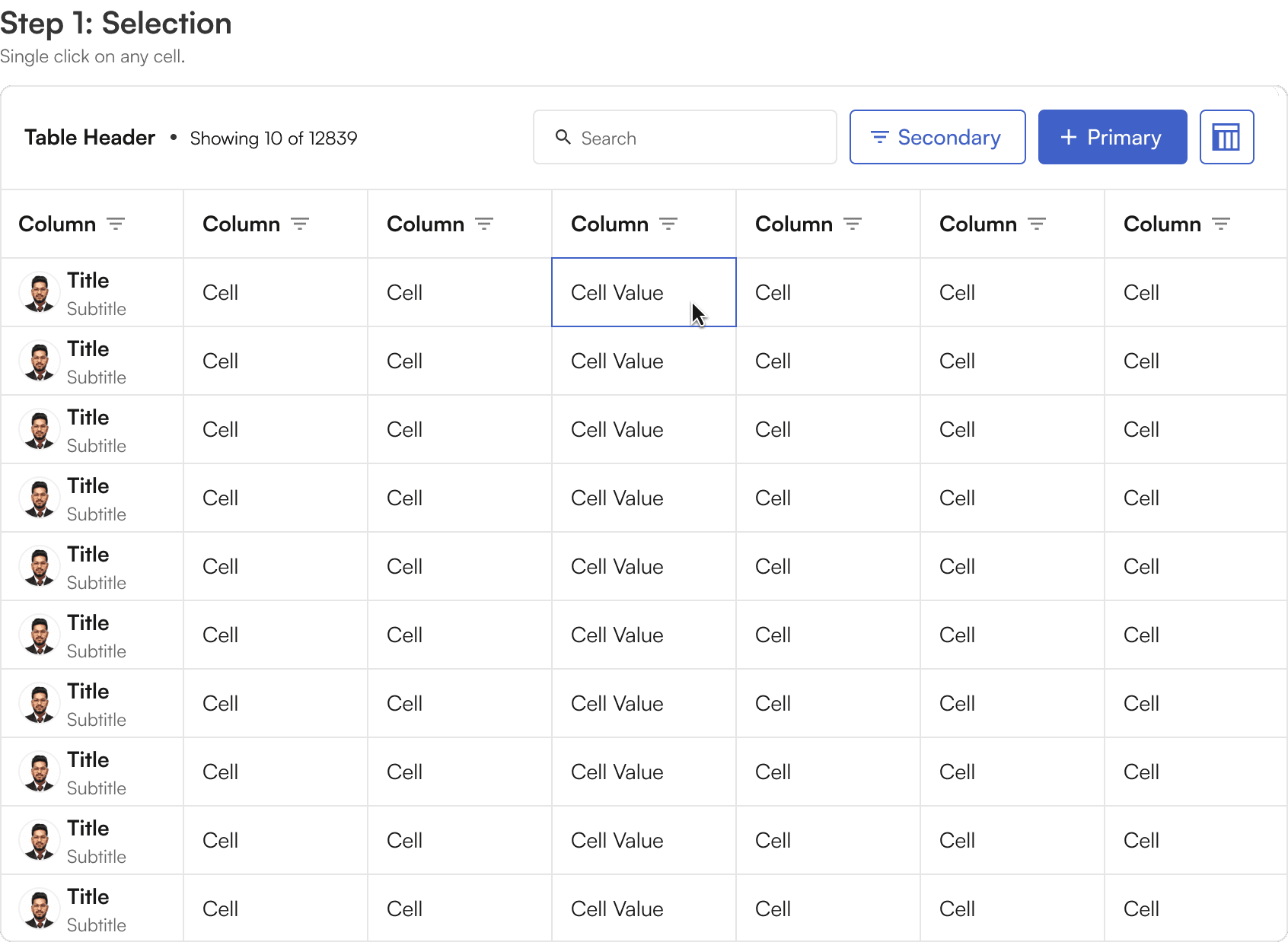 However, as listed in the BEAT's UI kit grid section, many other data types or specially formatted text can be contained in the cell, including drop downs, phone numbers, currencies, and date pickers.