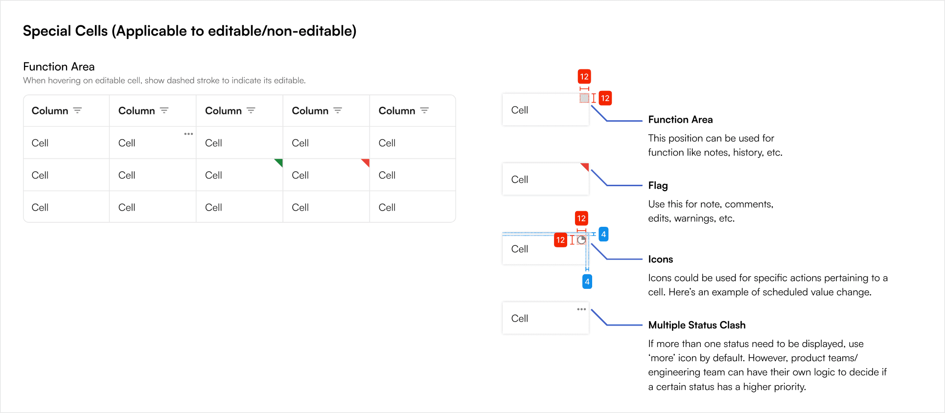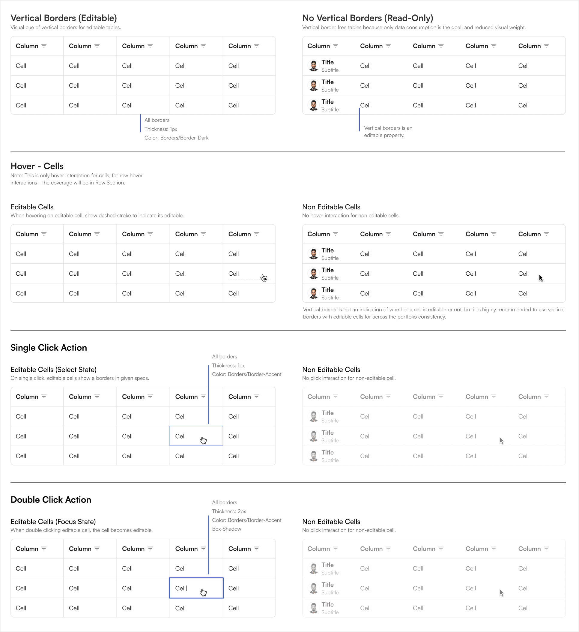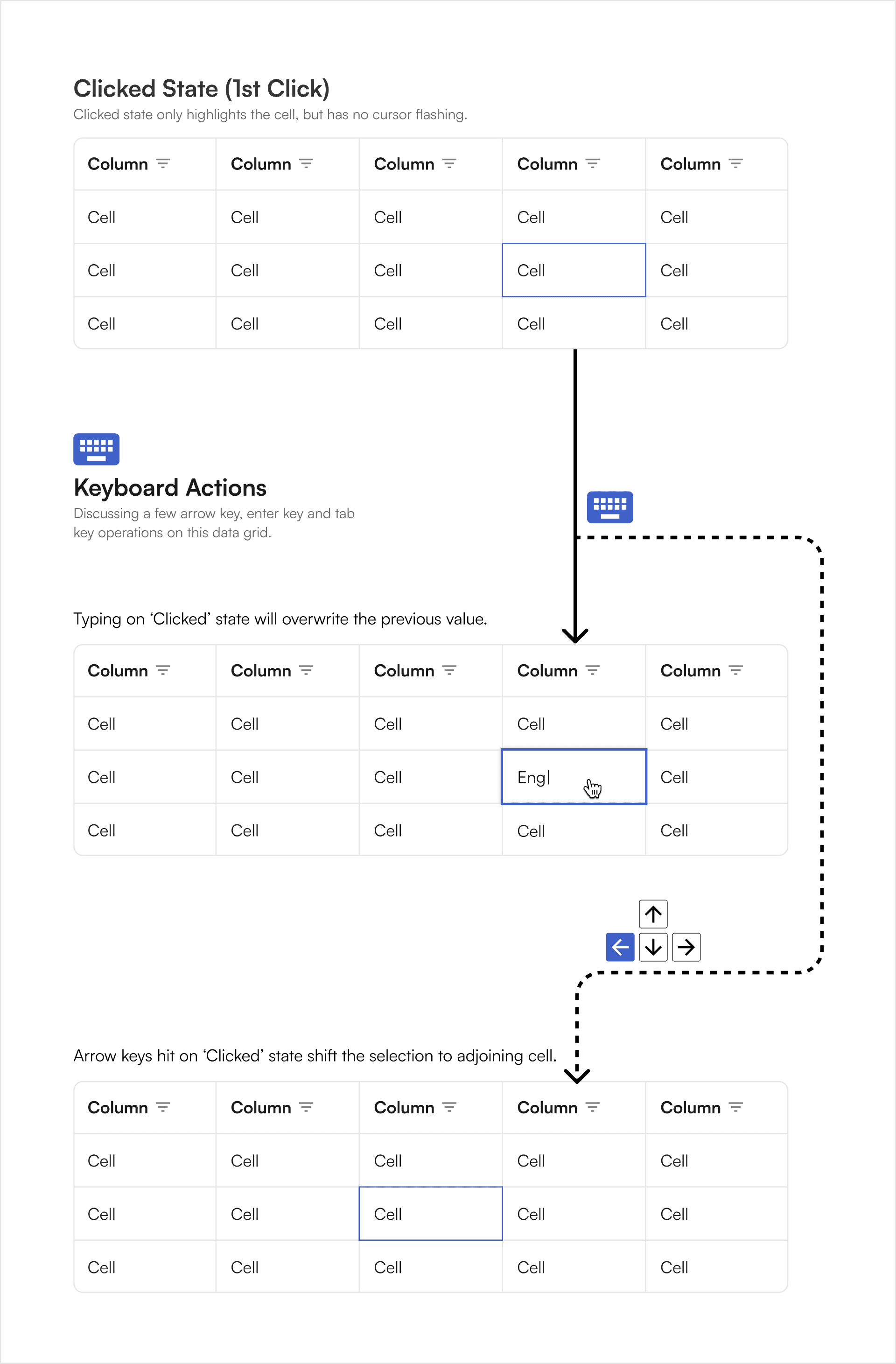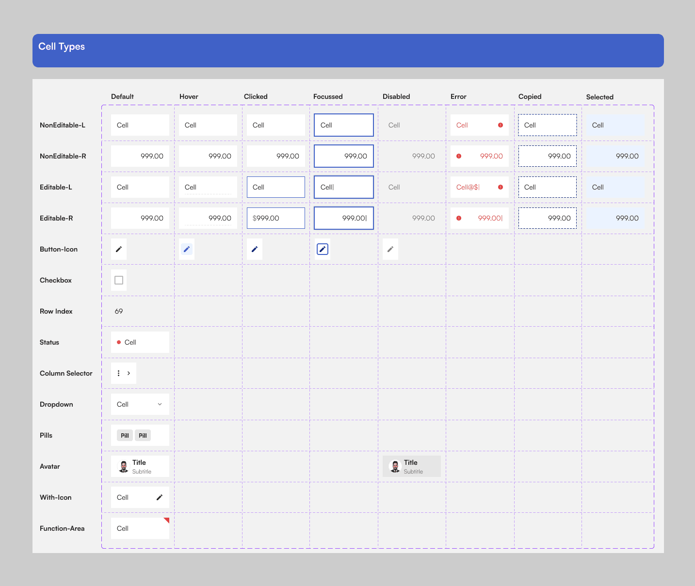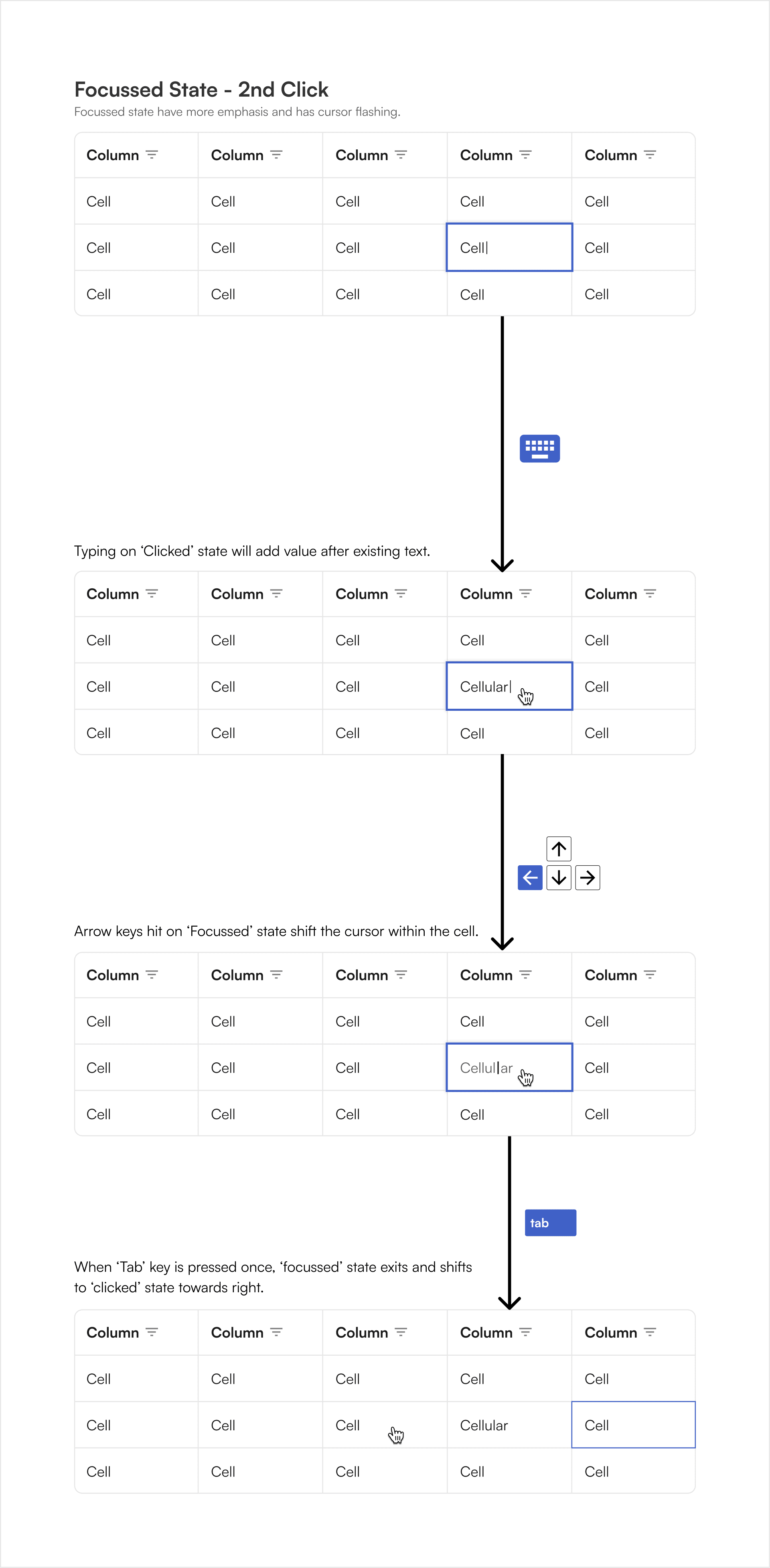 Cells can be in a number of different states. This is needed to support the different types of edit interactions both through mouse and keyboard navigation.