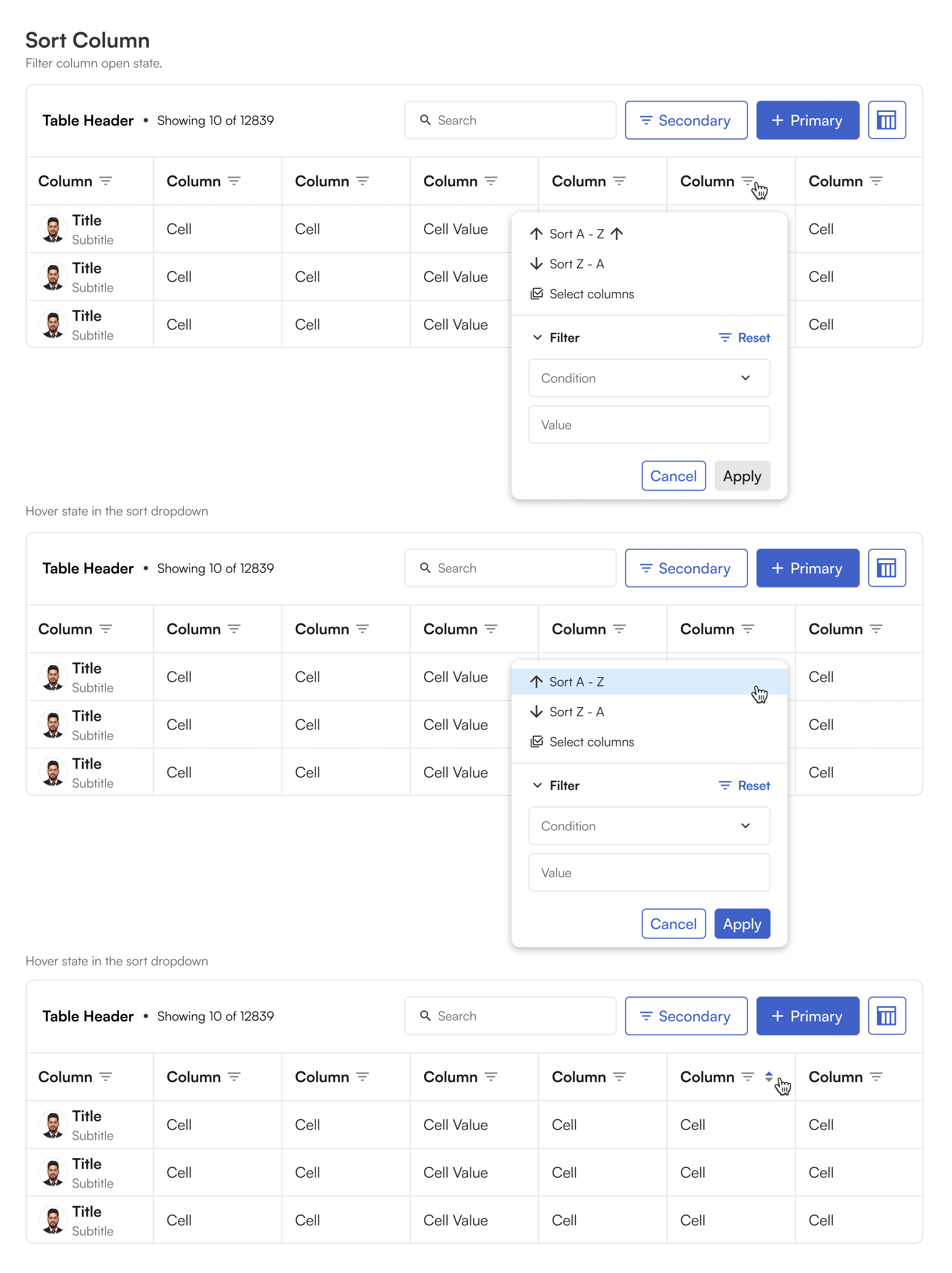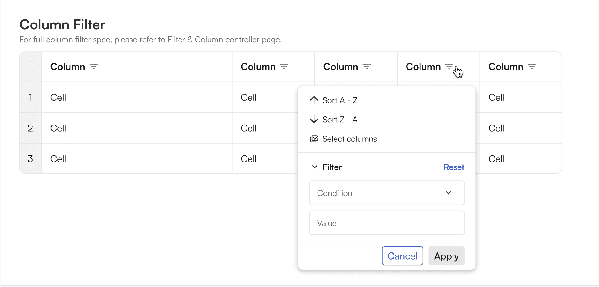 Filter dropdown allow quick access to sort like features at the same time, filtering columns based on preset conditions. The column filter dropdown changes with data type it is being opened at.