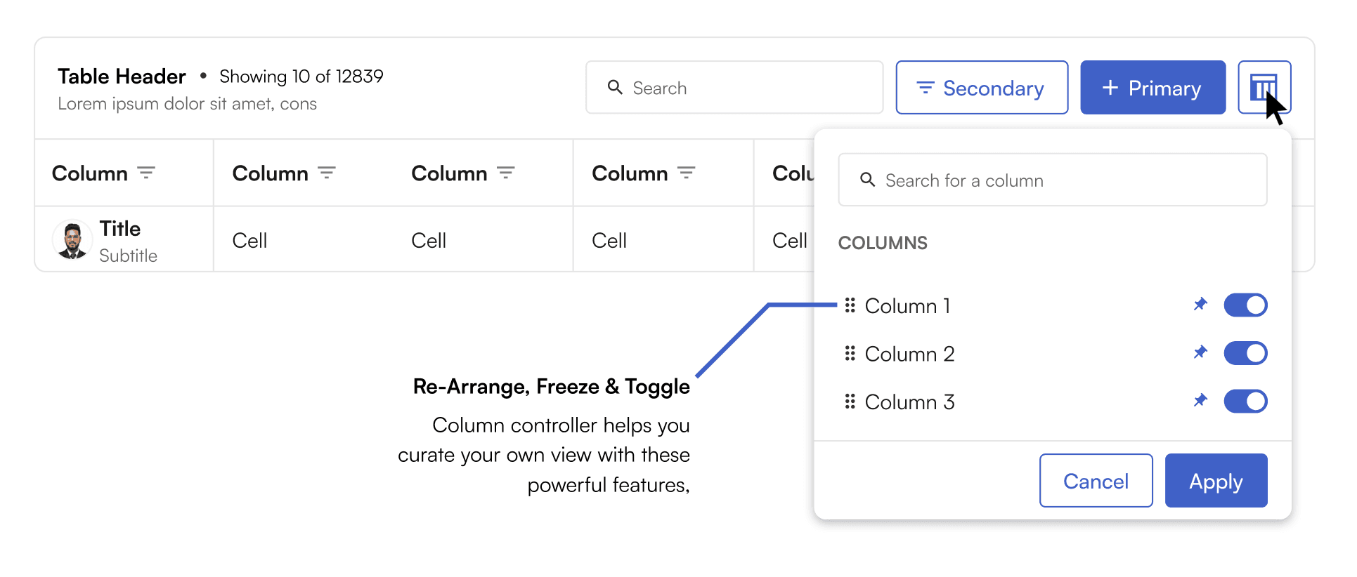 Column controllers allow curating your own view of the table by re-arranging, freezing and toggling the columns. The column controller is a toggle prop and can be decided by product teams whether to have it or skip it.