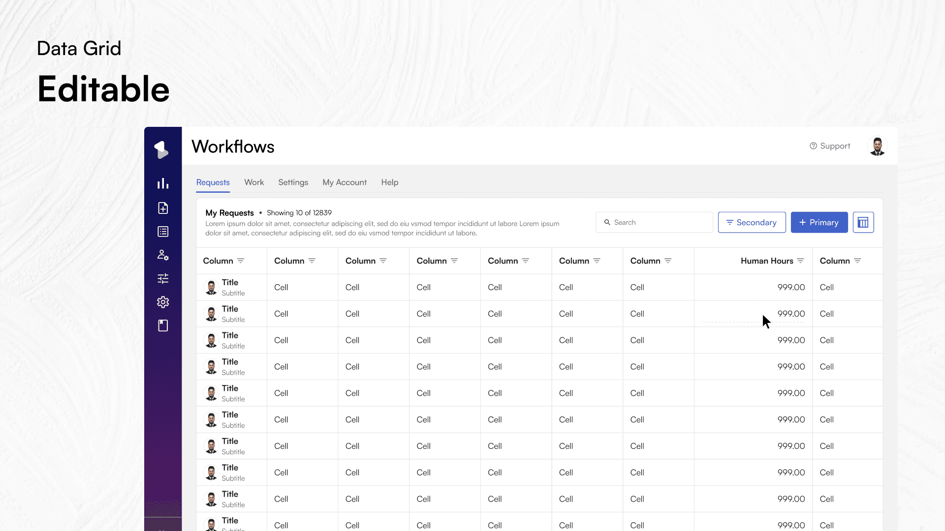 These grids, mostly used by analysts/admins who edit items for data entry, editing, and deletion. They are visually differentiated from the read-only grid by the presence of vertical borders around every cell. Additionally, an editable cell is further indicated by dotted line inside of a cell as shown in the image below.