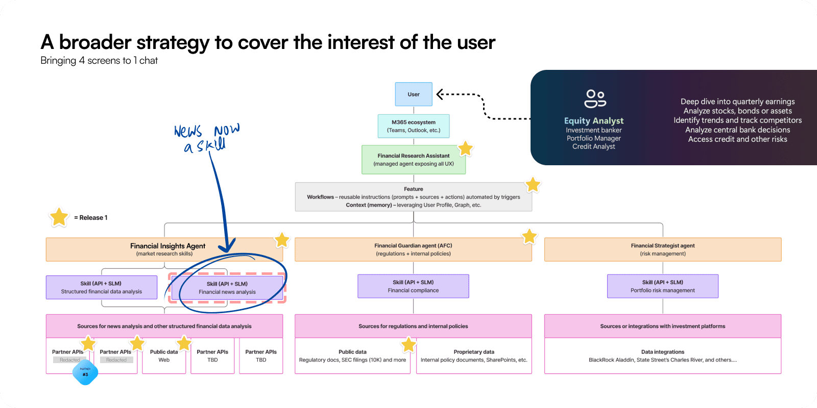 My contribution focused on how these collaborations translated into usable experiences. I worked on mapping how partner intelligence connects with Microsoft tools like Word, Teams, and Excel, making sure every agent felt natural within the flow of work. Over time, these connections became patterns that other teams could pick up, adapt, and extend into new areas of the financial ecosystem.