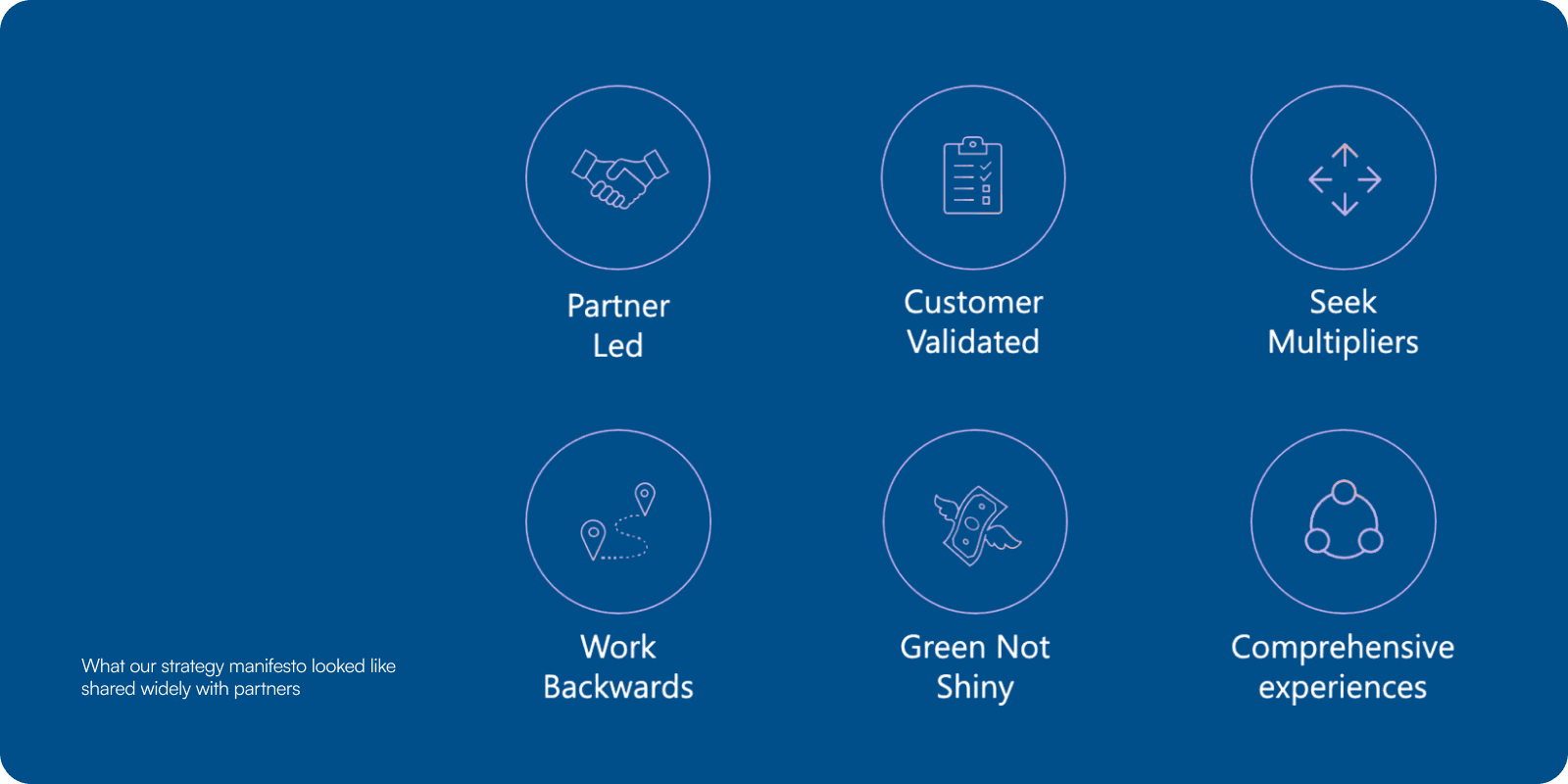 To make that work, we wrote down what we called our “strategy manifesto.” It became the playbook everyone could refer back to when things got messy. Partner led, customer validated, seek multipliers, work backwards, green not shiny, and build comprehensive experiences. These six phrases captured the mindset we wanted every team and partner to share.
