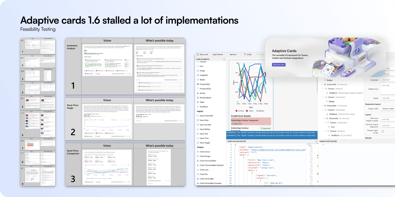 Standardisation also meant stretching into engineering feasibility. We had to validate what the adaptive cards framework could actually handle. Adaptive Cards 1.6 limited a lot of implementations, especially for interactive charts, so we ran experiments ourselves to uncover workarounds. Developers were clear: the framework needed to evolve.