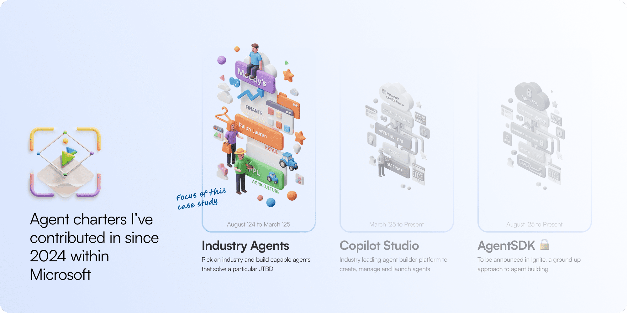At Microsoft Cloud for Industry, I worked with product and partner teams who already lived and breathed their verticals like finance, retail, healthcare, manufacturing. My part was to turn broad ambition into something that could be built, tested, and shared. We explored how agents could use real data safely, learn from context, and still stay interoperable across Microsoft’s ecosystem.