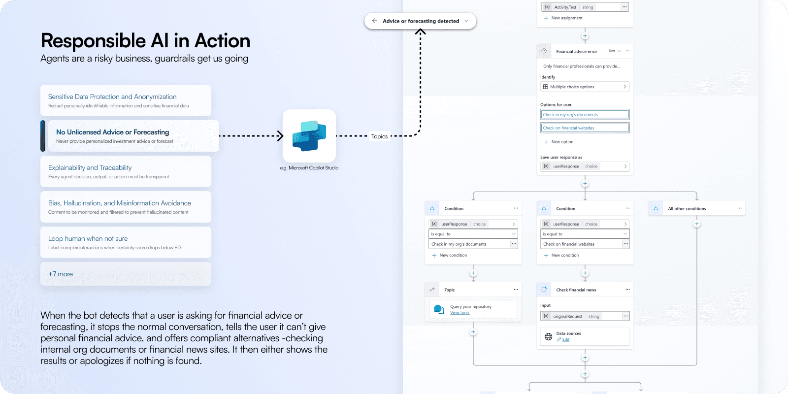 Built through Microsoft Copilot Studio, this flow automates the right kind of caution. Sensitive data is anonymized, every action is traceable, and hallucinated or biased content is filtered out. If confidence in an answer drops, the agent loops in a human reviewer instead of guessing. These guardrails let us design responsibly for high-stakes decisions, giving analysts the freedom to explore insights while keeping the system auditable and aligned with strict financial regulations.