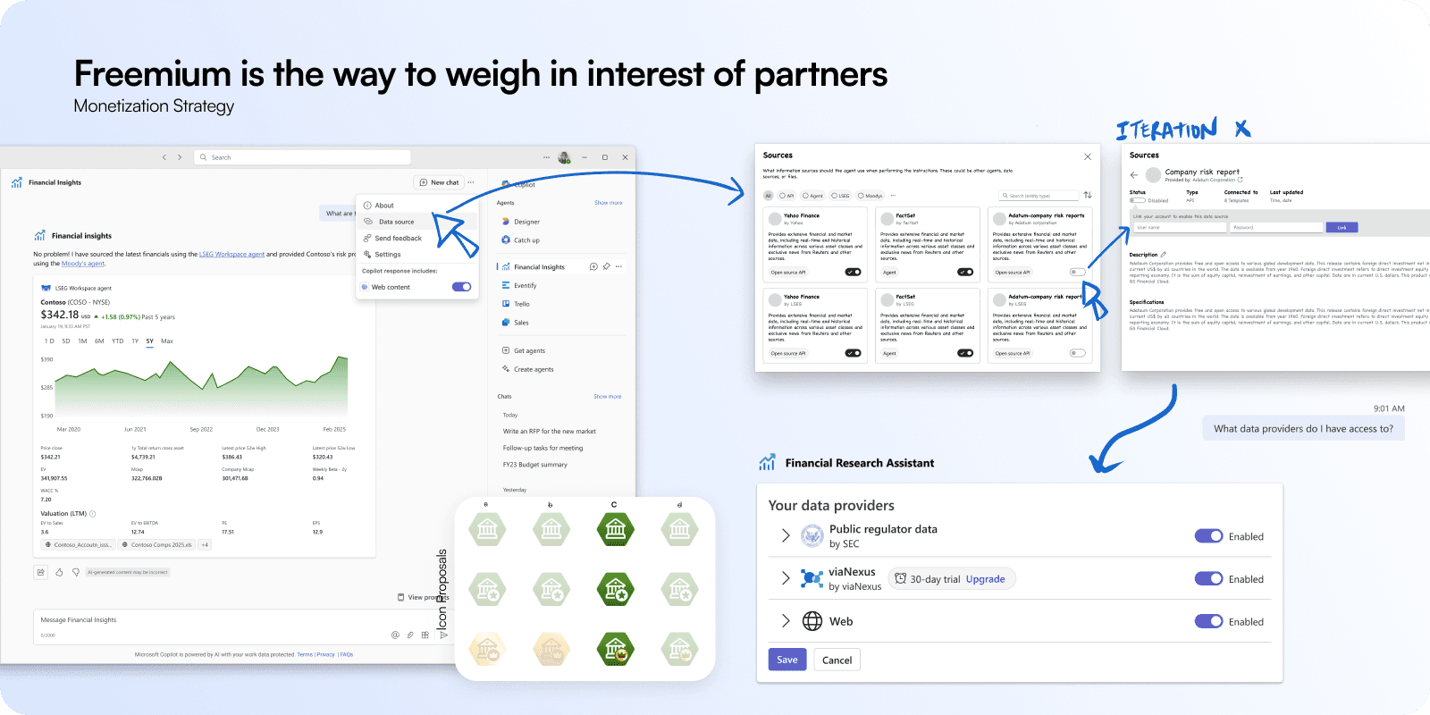 The idea was to make premium data approachable. A freemium tier let teams explore public data sources, while partnerships with providers like Moody’s and LSEG unlocked enterprise-grade insights. This balance created a scalable path for experimentation without losing enterprise control. We did some logo experimentations to cover the message in a way that communicates the same to users.