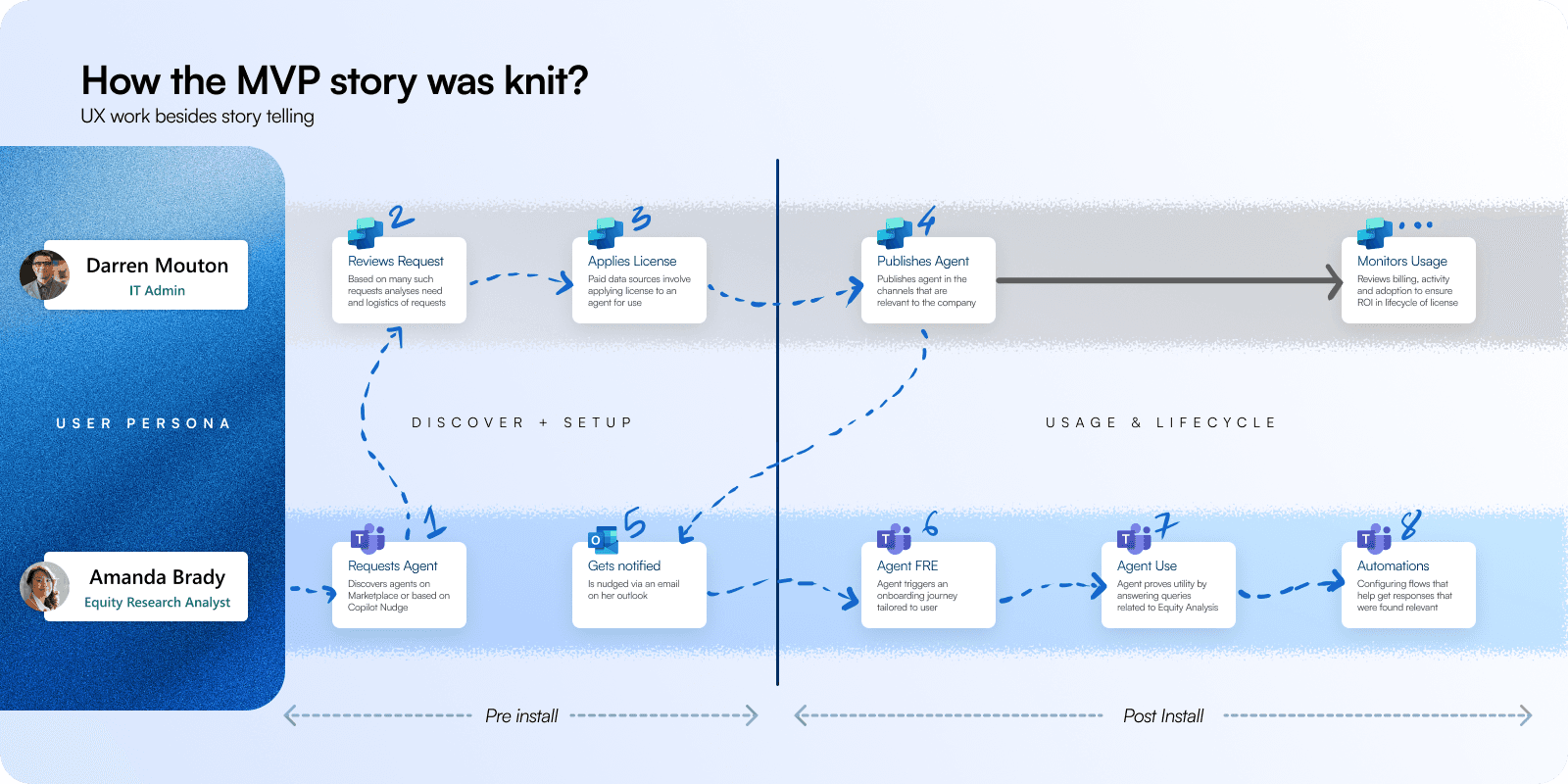 We started with a first run journey of an equity analyst finding a useful Financial Insights agent and an IT admin who handles agent requests. One needed precise insights and automation; the other needed secure control. Our MVP journey mapped everything from discovery to reporting linking setup, licensing, monitoring, and day-to-day agent use into a seamless story.