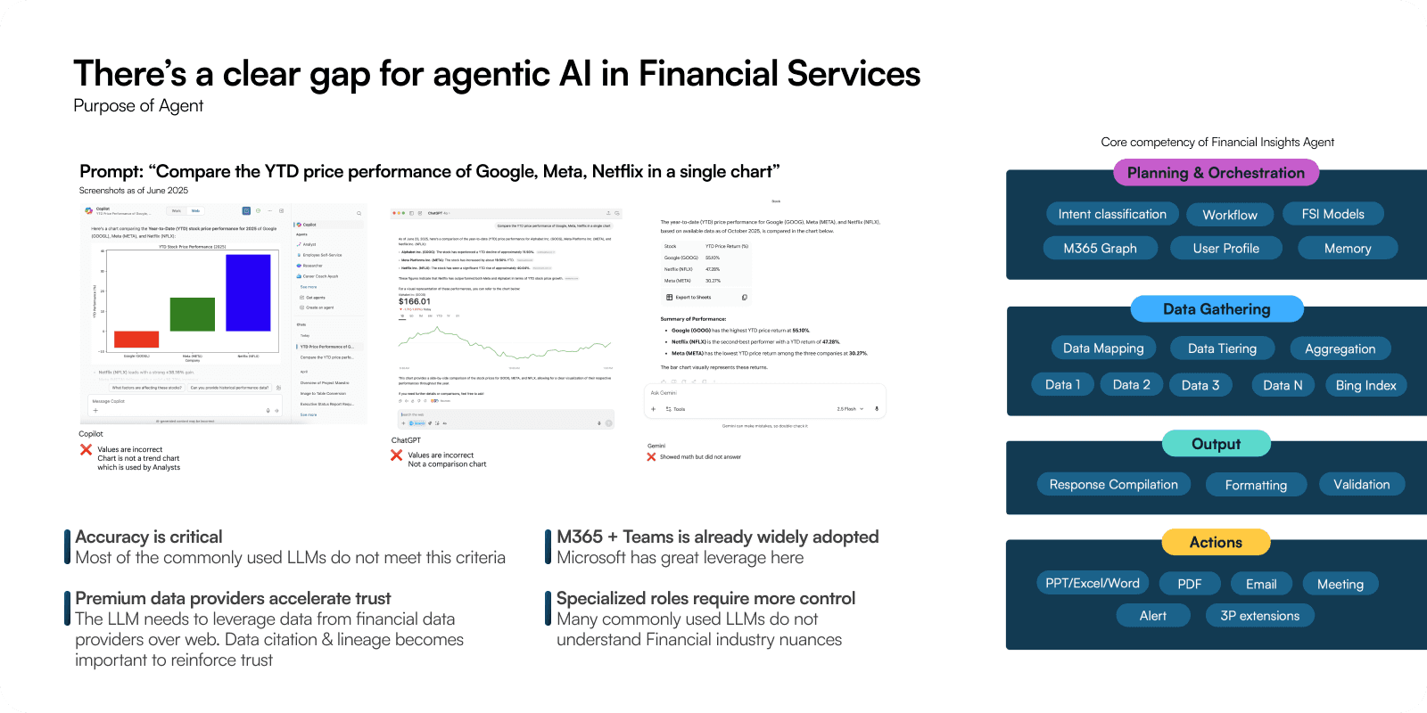 While Moody's posed challenge on how a report is structured in Teams chat had a lot of friction in building alignment, Financial news copilot an agent driven by another partner had other challenges from an execution standpoint.