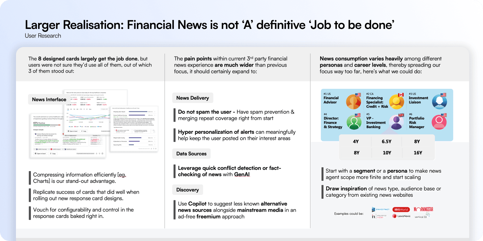 Through all of this, one big realisation emerged. Financial news alone was never the job to be done. For FSI users, news is only a medium to achieve something else research, awareness, or tracking. They need actionable insight, not just information. That shifted our thinking entirely.